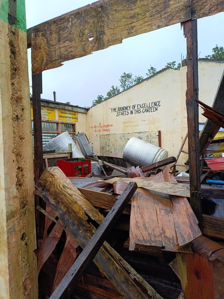 Dahil sa bagyo, nagibâ ang isa sa mga gusali ng kanilang paaralan. Naroon sa gusaling iyon ang kanilang canteen, faculty room, at stock room. Maging ang computer room sa kalapit na gusali ay lubhang napinsala.
