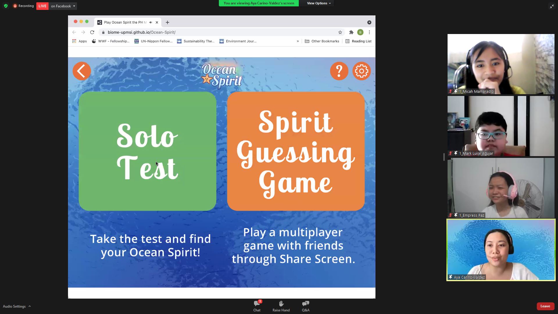 “Ocean Spirit” is a personality quiz and screen share game about different marine species of the Philippines that aims to highlight the rich marine biodiversity in the country and the need for biodiversity conservation in a fun and entertaining way. It was developed by Balangay Entertainment for the University of the Philippines Center for Research and Awareness of Diverse Living Environments (UP CRADLE) at Puerto Galera under the UP MSI, through the support of Toyota Motor Philippines Foundation, Inc. “Ocean Spirit” is one of the first projects of the UP Puerto Galera Biodiversity Center, which will have a program focused on science communication and environmental education to protect the Philippines’ Verde Island Passage (VIP), the global center of marine biodiversity.